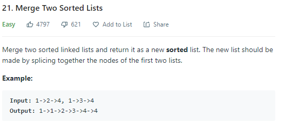 이 문제는 두 개의 정렬된 Linked List가 주어질 때, 두 Linked List를 합쳐 정렬된 Linked List로 return 하는 문제이다.