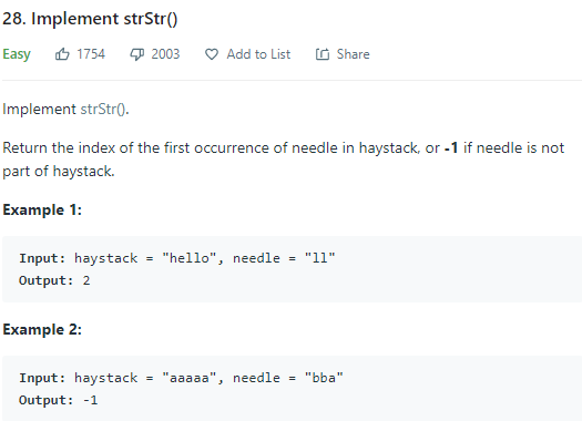이 문제는 haystack의 문자 안에서 needle의 위치를 찾는 문제이다. 존재할 경우 index값을 없다면 -1 값을 return 한다.