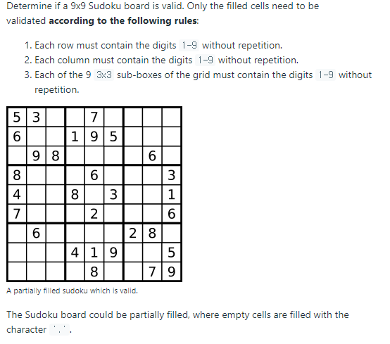 이 문제는 우리가 스도쿠 문제가 주어질때 가로, 세로, 하나의 grid안에 같은 수가 있는지 확인하고 있다면 False를 return하는 문제이다.