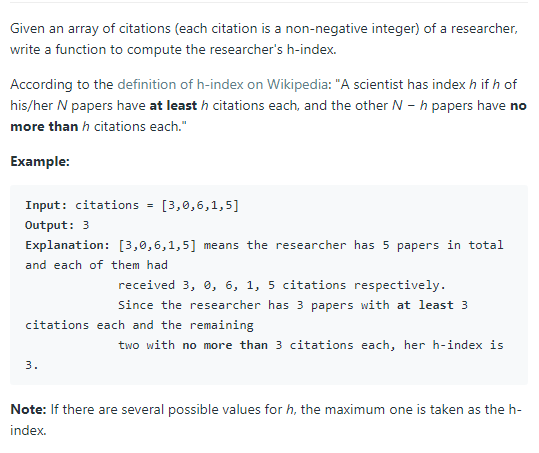 이 문제는 주어진 리스트에서 H개 이상 citation이 된 것들을 찾는 문제로 H index를 찾는 문제이다.