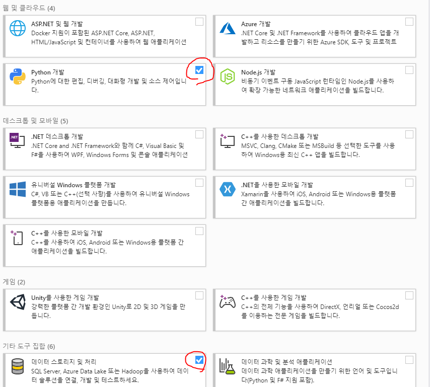 설치가 완료가 되면 세부항목을 어떤 걸 사용할지 나오게 되는데 목적에 맞게 필요한 항목을 눌러 설치한다.