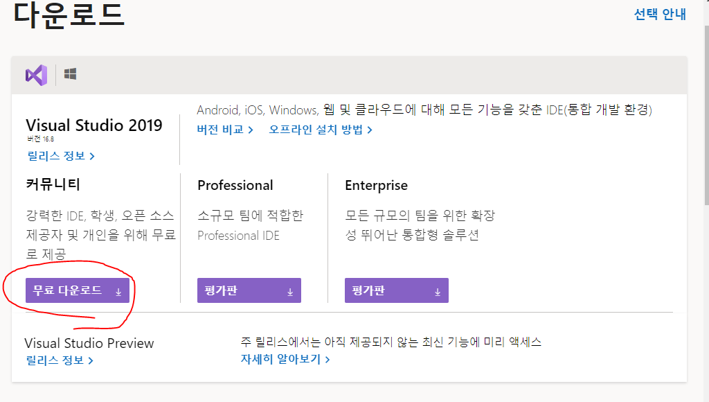 다운로드 링크는 visualstudio.microsoft.com/ko/downloads/ 여기서 받을 수 있다.